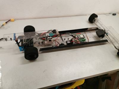 El coche, está diseñado a partir del tren trasero y las manguetas delanteras de un antiguo fórmula 1 escala 1/10 (marca 3racing , modelo F109) es la típica configuración de motor transversal junto al eje rígido que integra un diferencial de bolas en la corona en este caso con ruedas de espuma. El tren delantero se ha ensanchado casi al del panel para aportar estabilidad y al tiempo garantizar el agarre lateral del trasero al dejarlo en su medida original mucho más estrecho. El resto del chasis está hecho con láminas de policarbonato de 3mm de espesor procedentes de recortes (salvados de la basura) sobrantes de la elaboración de mamparas protectoras y que aportan una buena torsión y un peso bastante bajo. Utiliza un servo de dirección básico y de consumo moderado Hitec HS325HB alimentado por las pilas reglamentarias junto con el receptor y el esp32 que supervisa la tensión procedente del panel y atenúa la señal de control del acelerador (canal 2 del receptor) solo si dicha tensión baja de 18v como pseudo mppt.